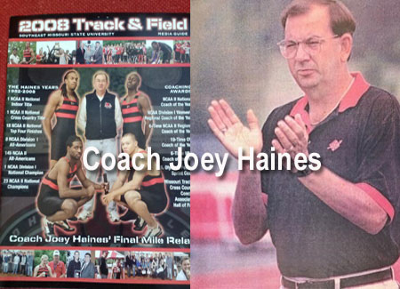 Coach of SEMO Track Joey Haines 1982-2008 Born:1947 Died: June 13, 2023 While he is most widely known for his notable success as a track and field coach for Southeast Missouri State University (SEMO), those close to him knew that the characteristics which he was most proudly defined by were his devotion to God, first and foremost, and a deep love for his wife, Jane, children, grandchildren and family (the definition of which extended to include all of his beloved athletes).