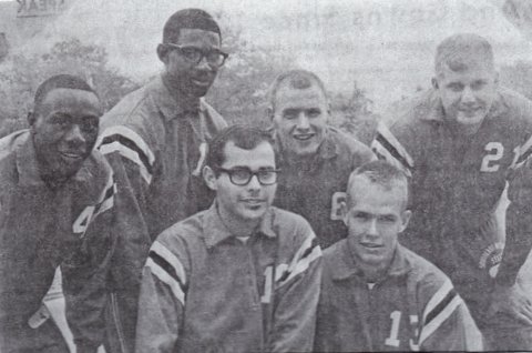 1966 MIAA Track Event Champions Back L-R: Curtis Williams (High Jump, Long Jump), Walter Smallwood (440 Relay), Bruce Frankie (440 Relay), Paul Ebaugh (Discus). Front L-R: Dean Kimmich (440 Relay), George Hester (440 Relay). |
